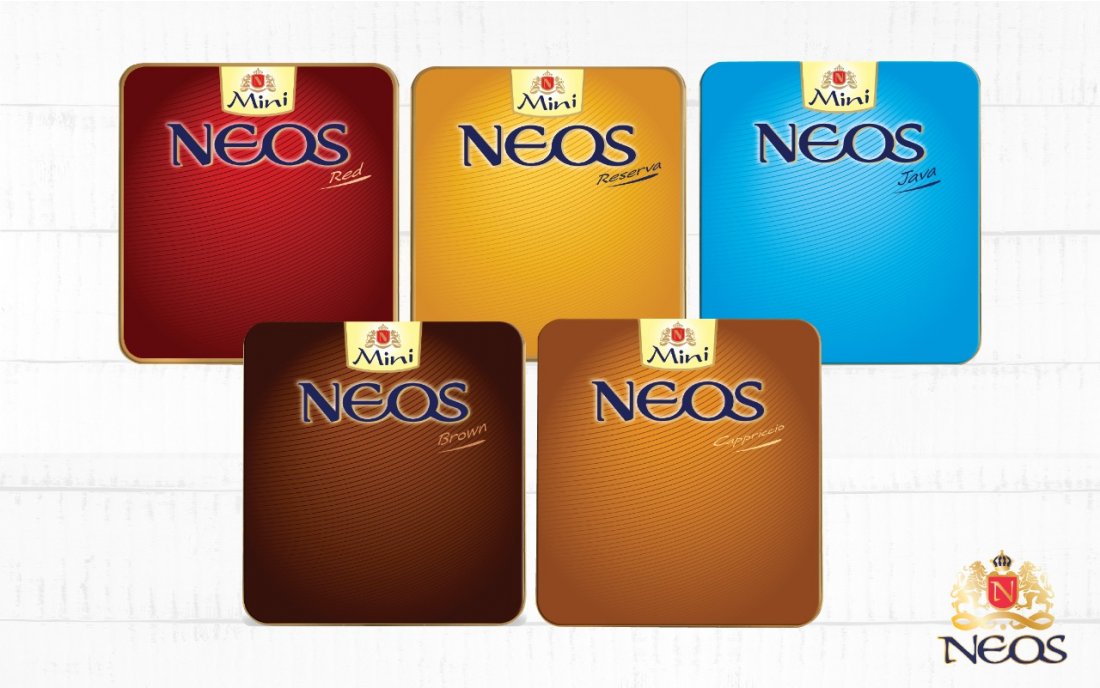 Una de sus marcas de excelencia es Neos, la cual es presentada bajo una amplia gama de sabores en su lata metálica mini. Cada cigarrito en su interior combina un sabor sofisticado y de calidad, bajo un precio super atractivo. Además, debido a su tamaño, es ideal para aquellos fumadores casuales o que recién comienzan, ya que su tiempo de fumada es corto y altamente placentero.